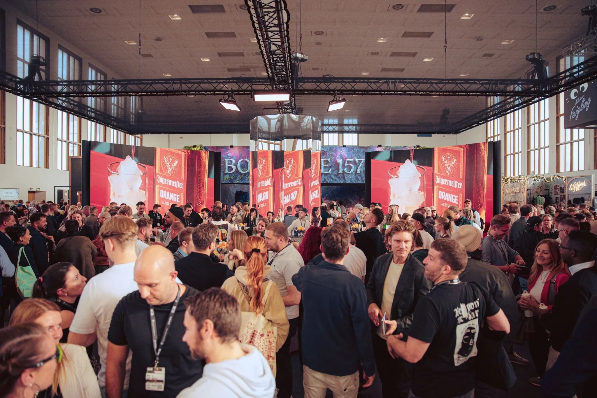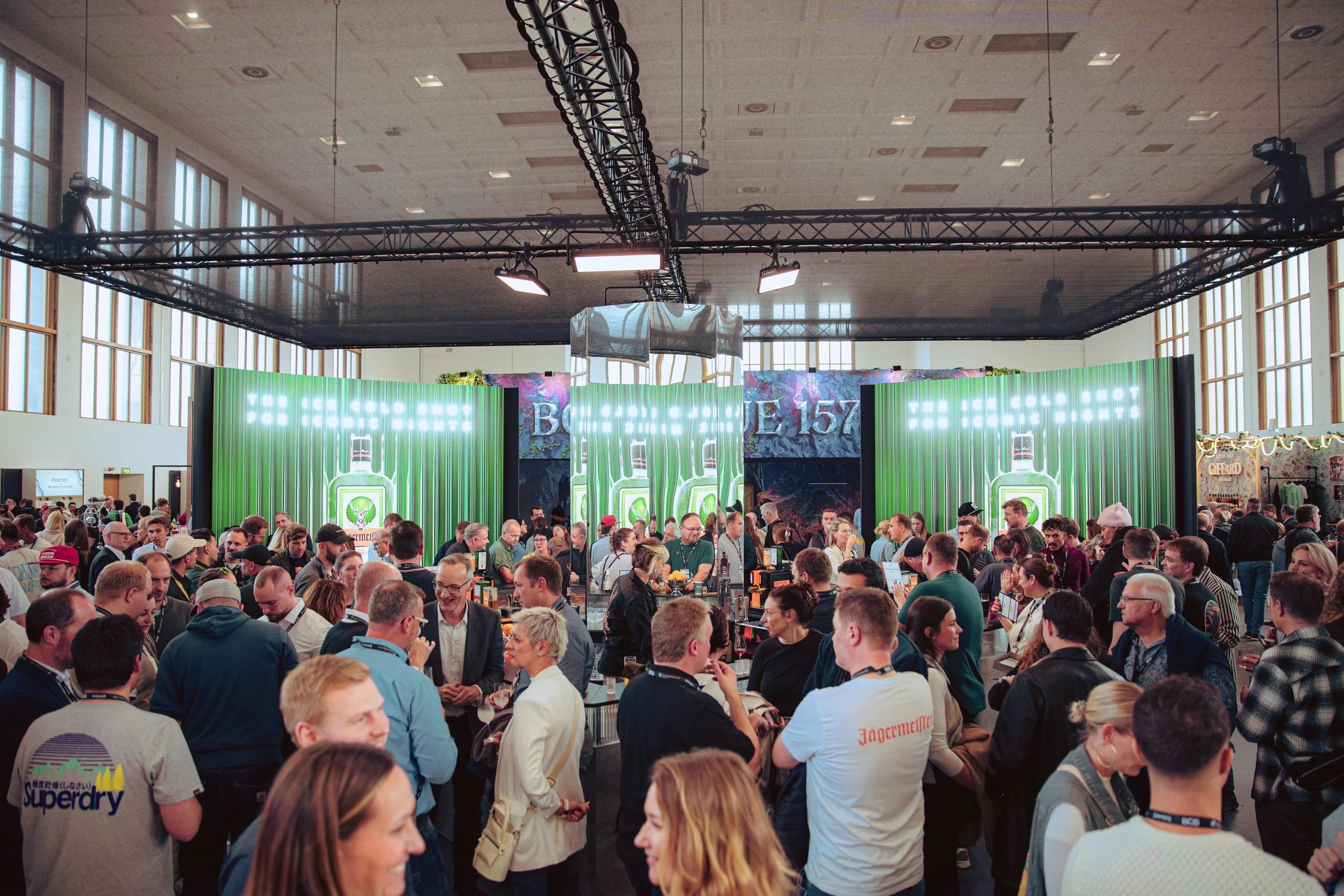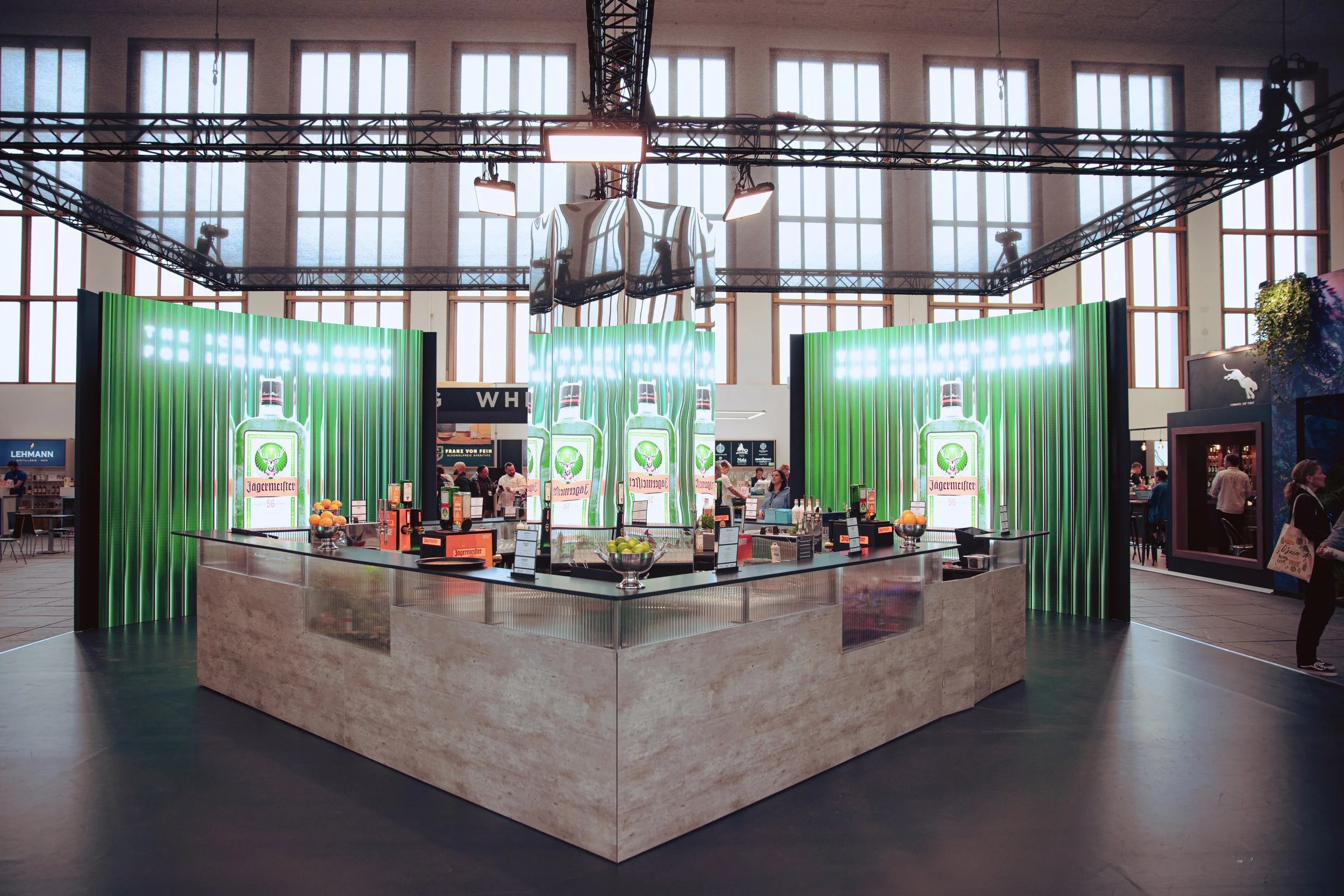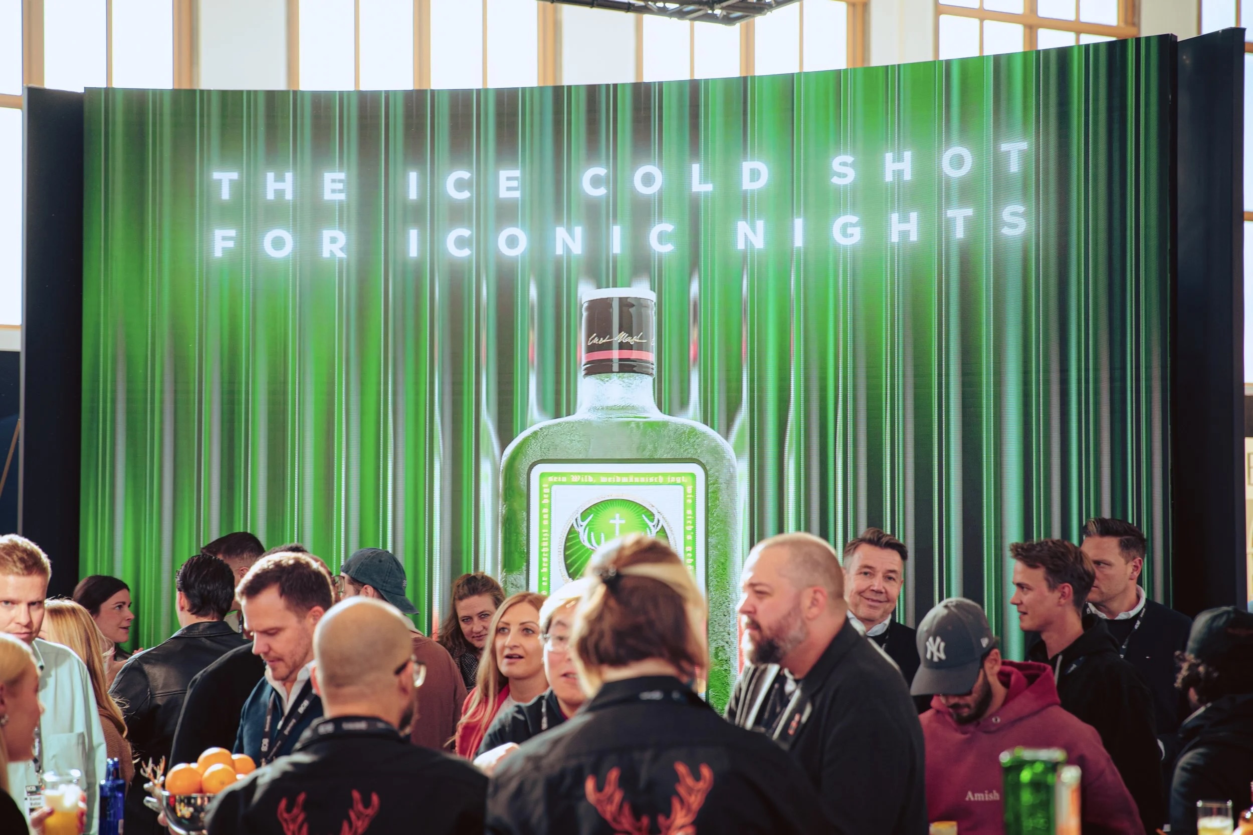entstand ein visuelles Konzept, das sich über 121 m², vier LED-Wände und eine zentrale Spiegelsäule in der Bar entfaltet. Content und Raum verschmelzen dabei zu einem gemeinsamen Erlebnis und setzendas gesamte Jägermeister-Portfolio wirkungsvoll in Szene :
